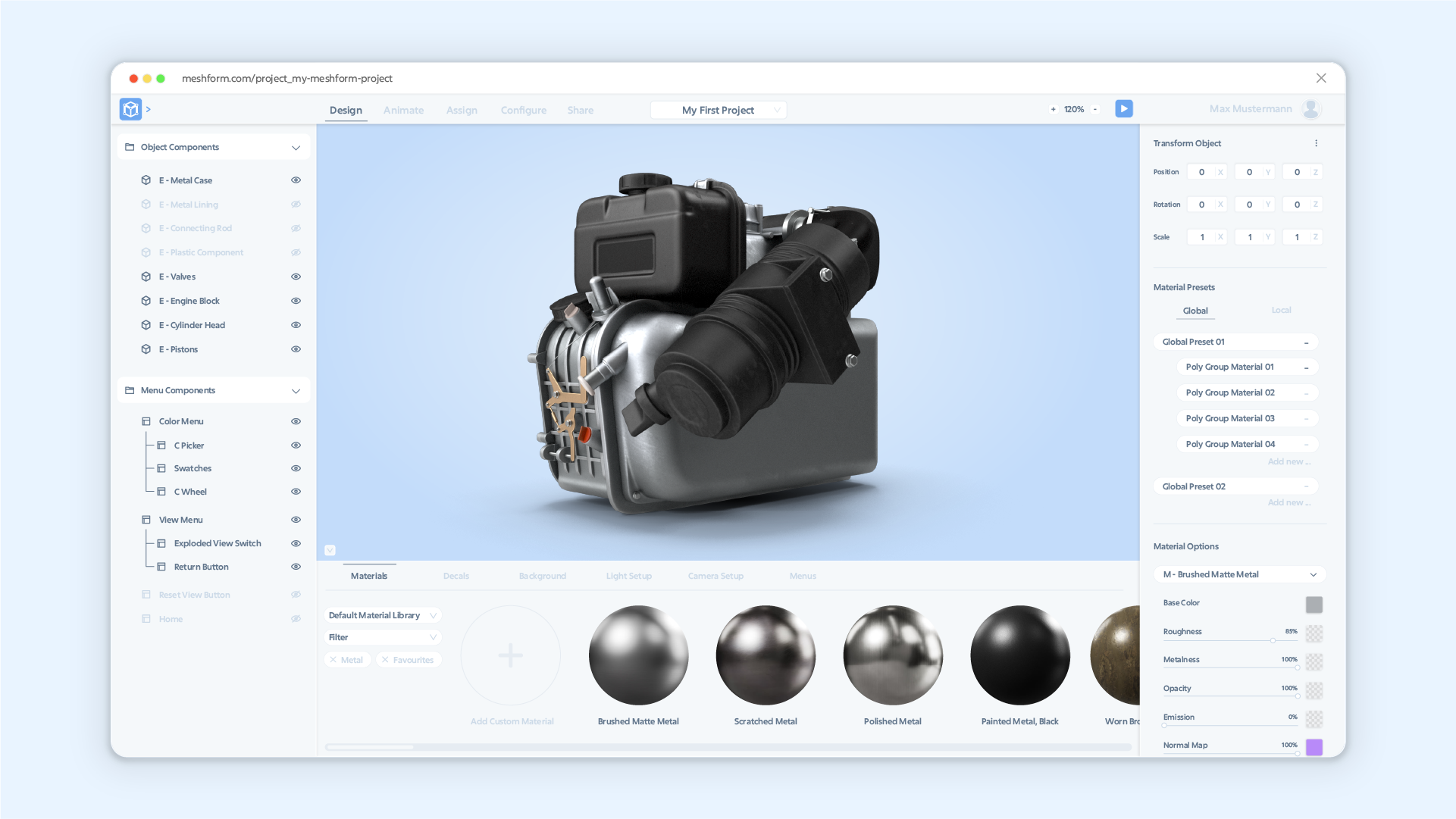 Meshform ist die No-Code-Plattform, die komplexe Konstruktionsdaten (CAD/STEP) automatisiert in interaktive Web-3D-Konfiguratoren verwandelt. Damit befähigt Meshform Industrieunternehmen, ihre Produkte ohne Agenturaufwand und ohne Programmierung digital erlebbar zu machen.