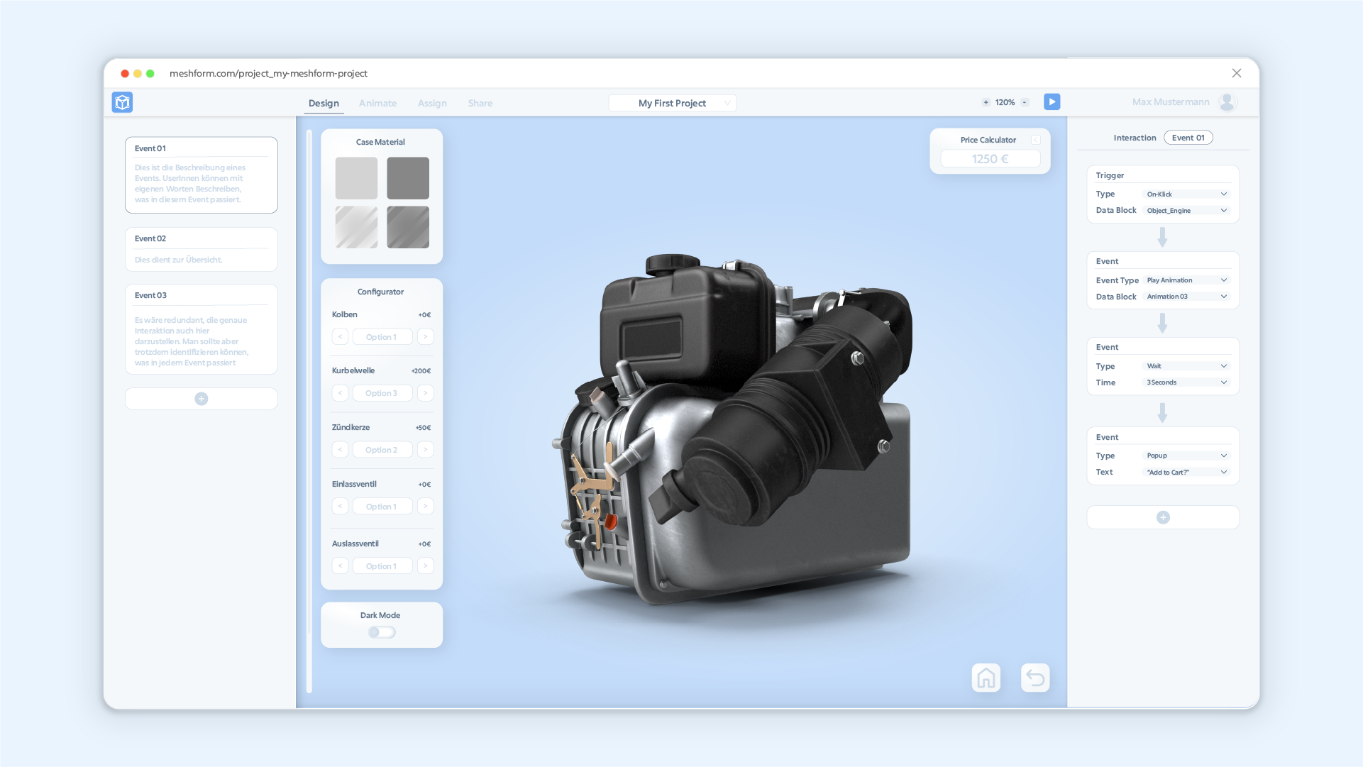 - Einfachheit: Materialien, Kamerawinkel und Logik intuitiv per Drag & Drop festlegen.